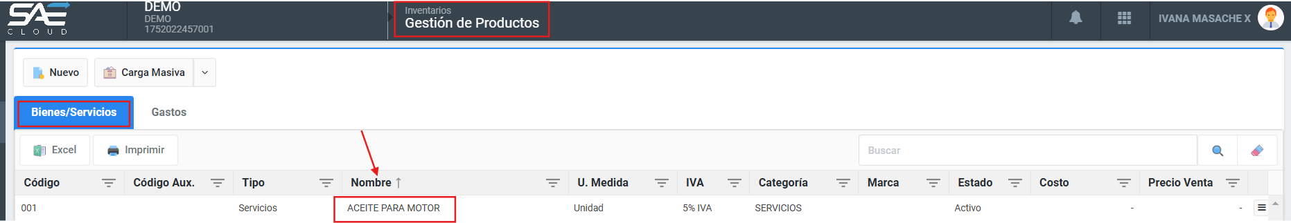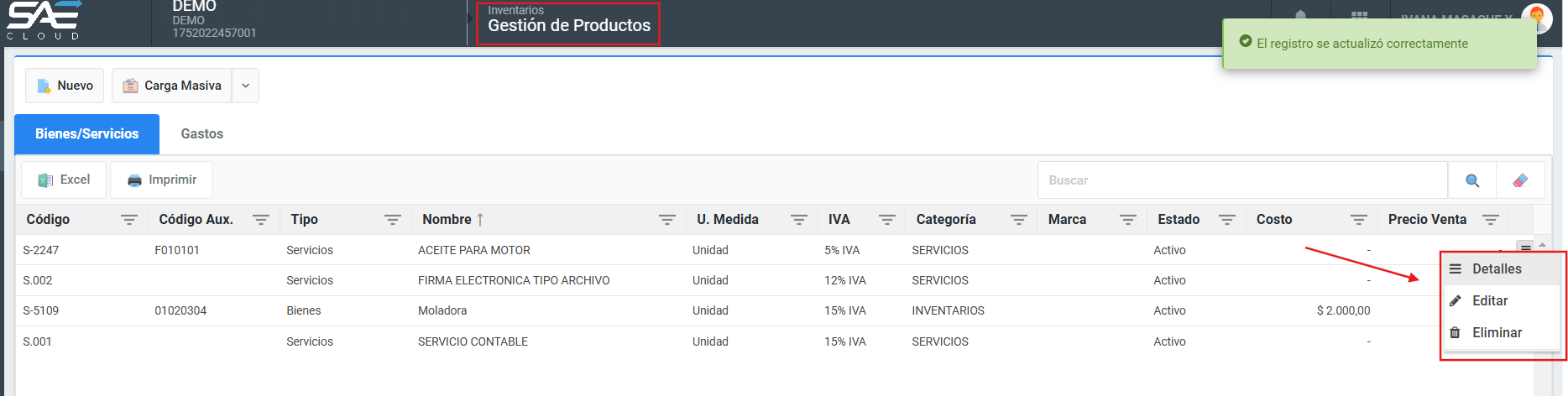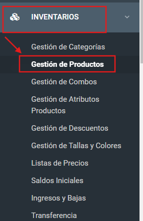 Paso 1: Ingresar al módulo Inventarios-> Gestión de Productos