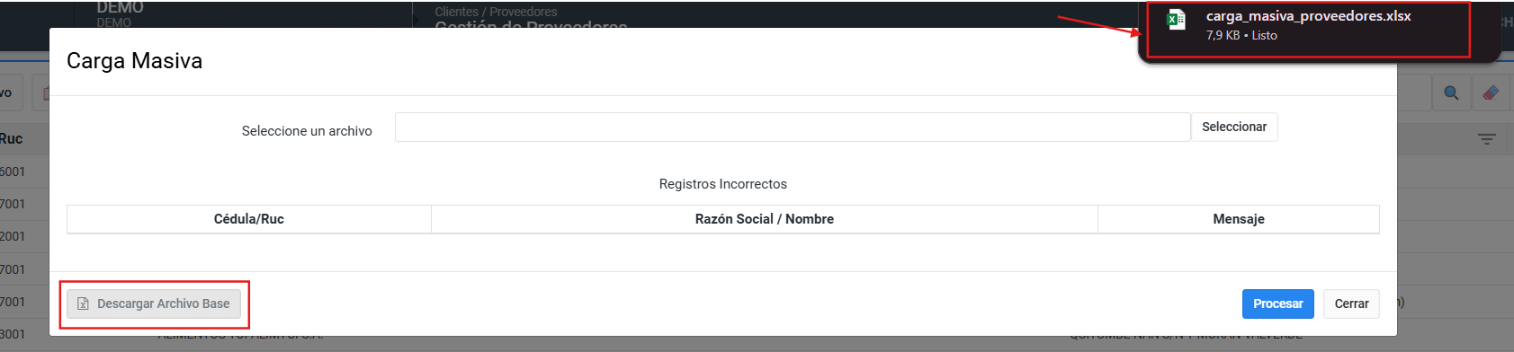 Paso 1: Ingresar al modulo Clientes /Proveedores -> Gestión de Clientes Paso 2: Dar clic en el botón Carga Masiva Paso 3: Dar clic en Descargar el Archivo Base. Paso 4: Se descargara automáticamente un archivo de Excel donde se debe llenar la ...
