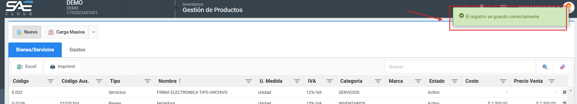 Paso 1: Ingresar al módulo Inventarios-> Gestión de Productos. Paso 2: Dar clic en el botón Nuevo Paso 3: En la pestaña General ingresar los datos de los Bienes Código: Código alfanumérico o presionar el botón Generar para que el sistema genere un ...