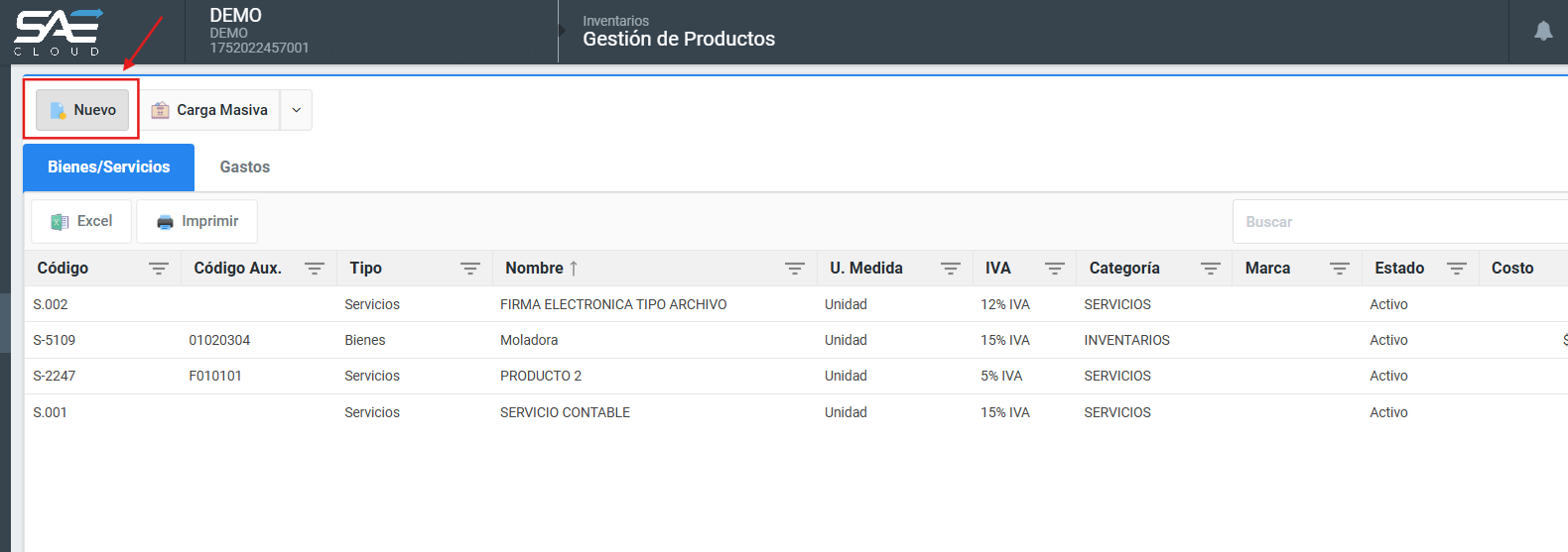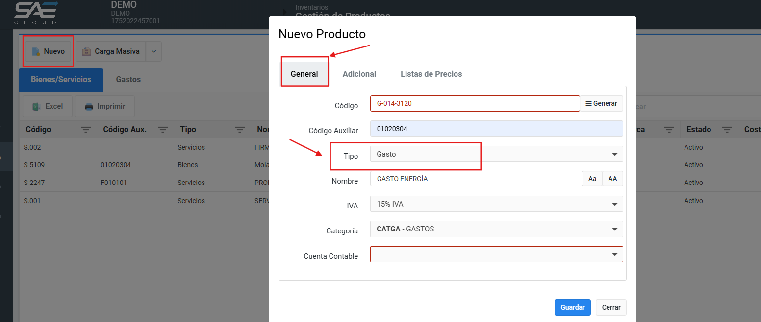Paso 1: Ingresar al módulo Inventarios-> Gestión de Productos. Paso 2: Dar clic en el botón Nuevo Paso 3: En la pestaña General ingresar los datos de los Servicios Código: Código alfanumérico o presionar el botón Generar para que el sistema genere un ...