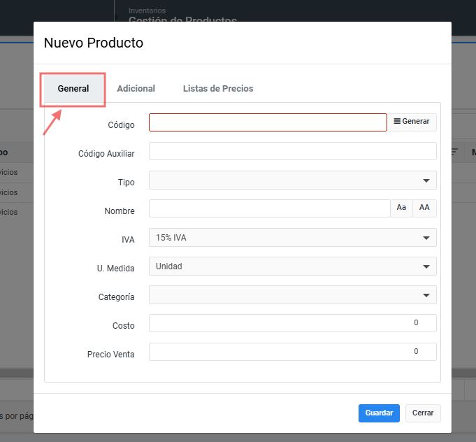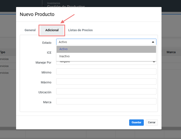 - Estado: Colocar si el producto se encuentra activo o inactivo.