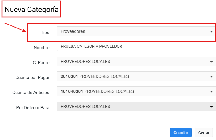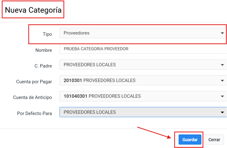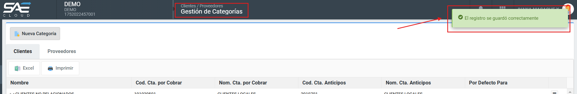 Paso 1: Ingresamos en el menú Clientes/Proveedores -> Gestión de Categorías Paso 2: Dar clic en el botón Nueva Categoría Paso 3: Llenar los datos correspondientes: Tipo: Nombre: Categoría Padre: Cuenta por Cobrar: Cuenta de Anticipo: Por defecto ...