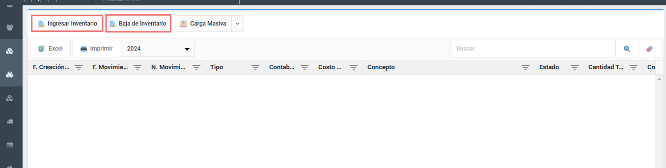 Paso 2: Dar clic en el botón Ingreso Inventario o Baja Inventario