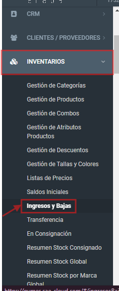 Paso 1: Ir al modulo Inventario -> Ingresos y Bajas