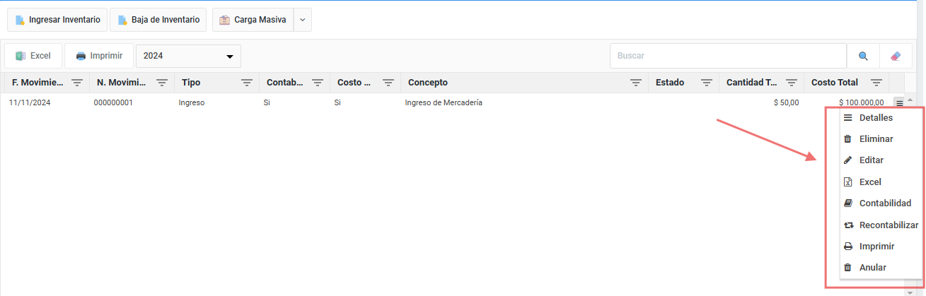 Si seleccionamos el ingreso/ baja y presionamos clic derecho vamos a tener varias opciones: