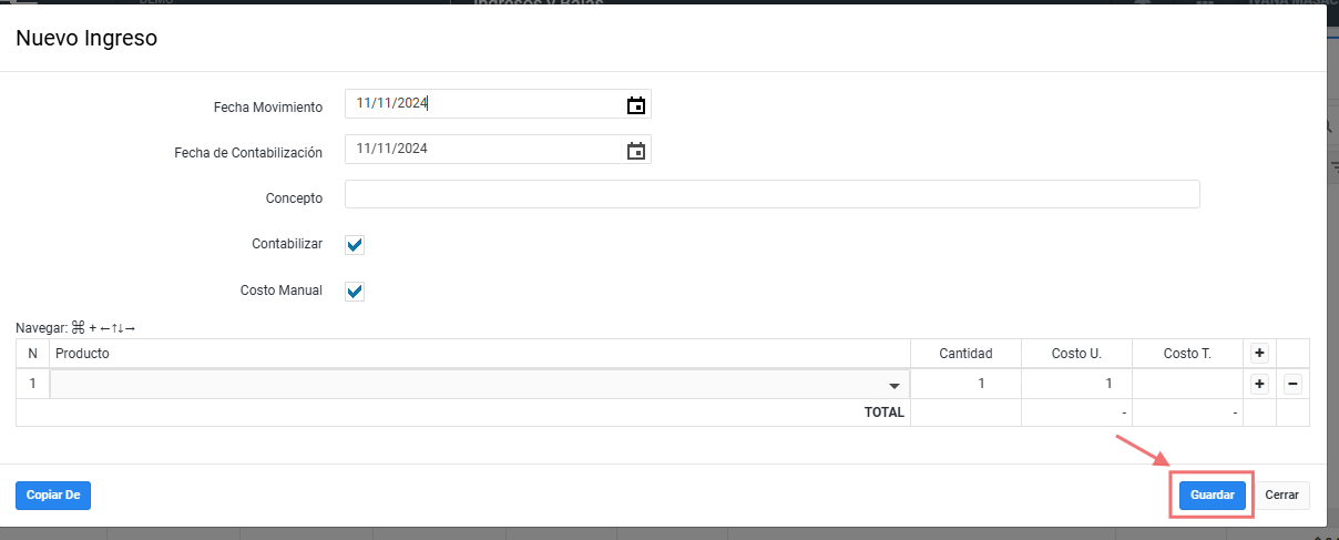 - Costo Manual: Si requiere ingresar el costo de forma manual activar el check Costo Manual