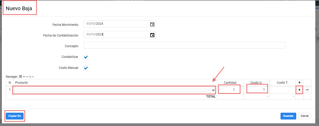Copiar De: Tenemos la opción de copiar de otra baja previamente guardada.