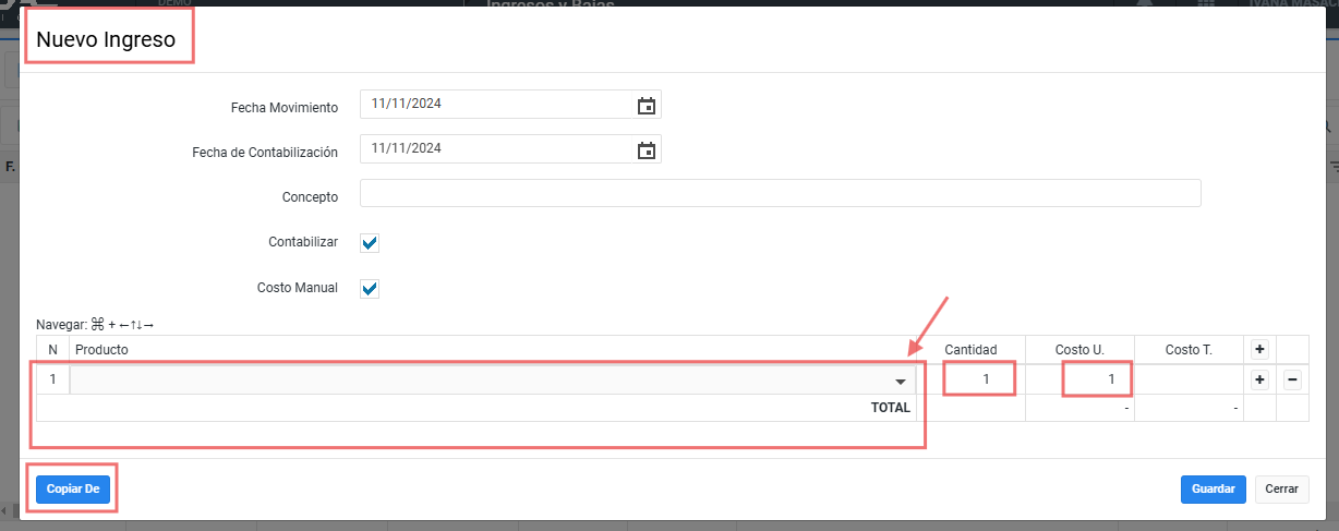 - Copiar De: Tenemos la opción de copiar de otro ingreso previamente guardado